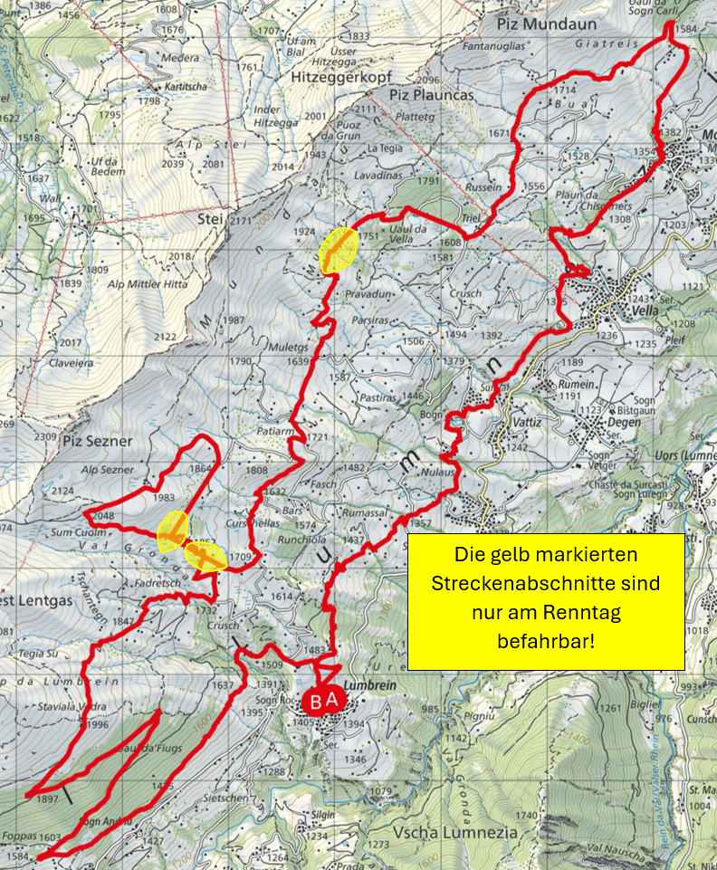 Die Strecke ist insgesamt 38 km lang. Das Rennen startet in Lumbrein. Es geht den Berg hinauf, über die Brücke „Val Mulin“ über einen schönen Höhenweg zur Alpstrasse welche nach „Staviala Vedra“ führt. Dem schnellsten steht der Bergpreis zu. Danach führt die Stecke über die Maiensässe von Lumbrein und Vignogn. Über die Alp Sezner gelangt ihr nach Morissen. Von Morissen aus, tretet ihr den Rückweg nach Lumbrein an. Über „Davos Munts“ und Vignogn erreicht ihr schliesslich das Ziel in Lumbrein.
